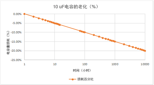 舉個例子,KEMET有一種編號為C1210C106K4RACTU的零件,這是一種具有X7R溫度系數(shù)的10uF的零件。KEMET說,這個零件在經(jīng)過回流焊接后的一段時間內(nèi),會有一個設(shè)計公差范圍內(nèi)的損失。他們用“十倍時”來衡量這個過程。這個“十倍時”的概念,是指比上一次測量長十倍的時間,也就是時間的對數(shù)尺度,不是線性尺度。